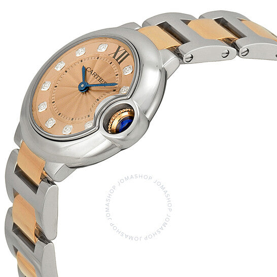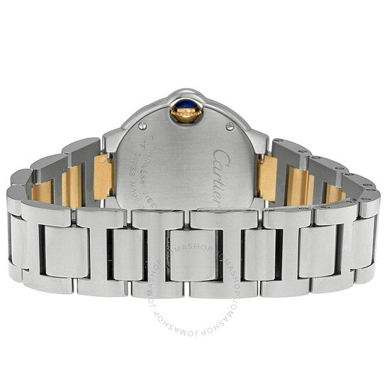 علبة من الفولاذ المقاوم للصدأ مع سوار من الفولاذ المقاوم للصدأ بوصلات من الذهب الوردي عيار 18 قيراطًا. إطار ثابت من الفولاذ المقاوم للصدأ. ميناء فضي بعقارب فولاذية زرقاء وعلامات ساعات من الماس. رقم روماني يُشير إلى موضع الساعة 12. علامات دقائق حول الحلقة الداخلية. نوع الميناء: تناظري. حركة كوارتز كارتييه عيار 057. زجاج ياقوت مقاوم للخدش. غطاء خلفي صلب. حجم العلبة: 28 مم. سمكها: 9.35 مم. شكلها دائري. عرض السوار: 20 مم. مشبك قابل للطي. مقاومة للماء حتى عمق 30 مترًا / 100 قدم. وظائفها: الساعات، الدقائق، الثواني. معلومات إضافية: مقاومة للمطر ورذاذ الماء، ولكنها غير مناسبة للغمر في الماء. تصميم كاجوال. علامة الساعة: صناعة سويسرية. ساعة كارتييه بالون بلو دو كارتييه النسائية بمينا فضي WE902052.