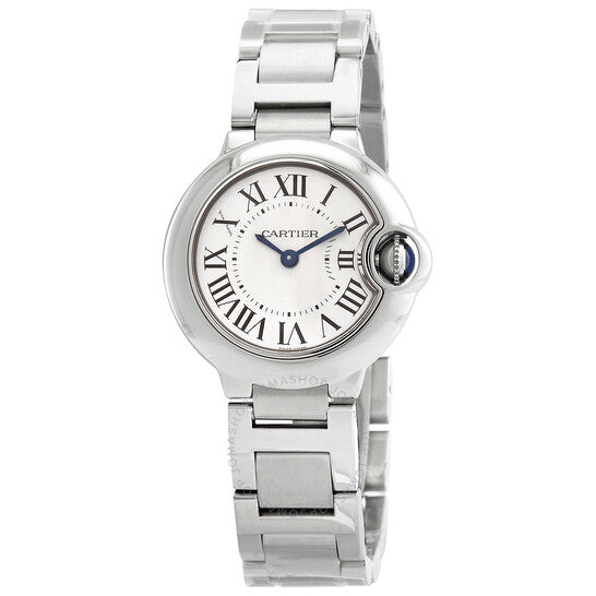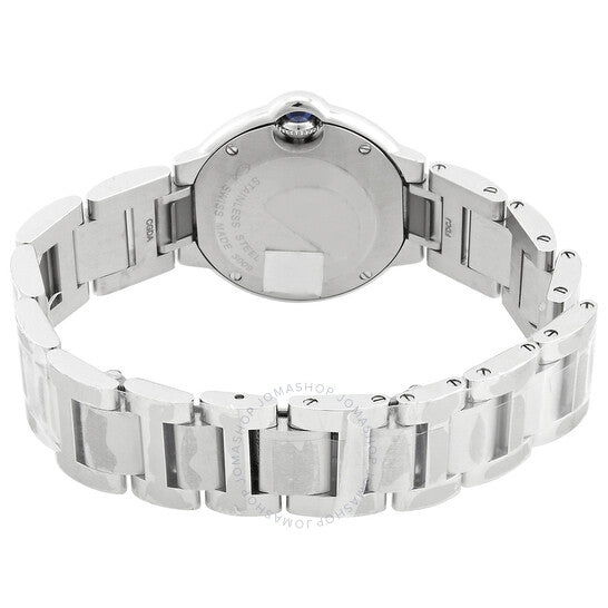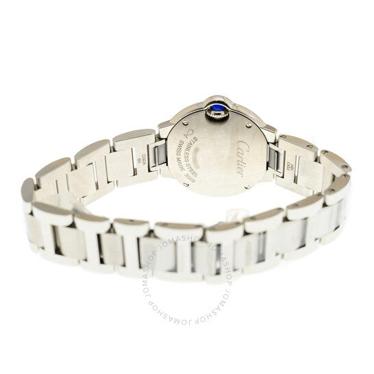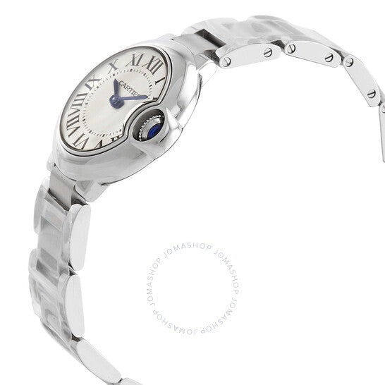 علبة وسوار من الفولاذ المقاوم للصدأ فضي اللون. إطار ثابت من الفولاذ المقاوم للصدأ فضي اللون. ميناء فضي اللون مع عقارب على شكل سيف من الفولاذ المزرق وعلامات ساعات بأرقام رومانية. مقياس دقائق حول الحافة الداخلية. نوع الميناء: تناظري. حركة كوارتز. زجاج ياقوت مقاوم للخدش. تاج كابوشون. غطاء خلفي صلب. شكل دائري، مقاس العلبة: ٢٨ مم. مشبك قابل للطي مع مفتاح أمان. مقاومة للماء حتى عمق ٣٠ مترًا / ١٠٠ قدم. الوظائف: الساعة، الدقائق. معلومات إضافية: العلبة الأصلية، بطاقة الضمان الدولية، دليل الاستخدام (ملحقات كاملة). سلسلة بالون بلو. تصميم ساعة فاخرة. علامة الساعة: صناعة سويسرية. ساعة كارتييه بالون بلو كوارتز نسائية بمينا فضي، WSBB0067.