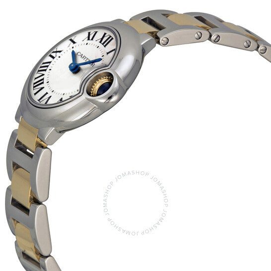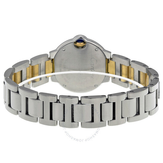 علبة من الفولاذ المقاوم للصدأ مع سوار من الفولاذ المقاوم للصدأ بوصلات من الذهب الأصفر عيار 18 قيراطًا. إطار ثابت من الفولاذ المقاوم للصدأ. ميناء فضي بعقارب زرقاء وعلامات ساعات بأرقام رومانية. علامات دقائق حول حلقة داخلية. نوع الميناء: تناظري. حركة كوارتز كارتييه عيار 057. كريستال ياقوت مقاوم للخدش. تاج من الذهب الأصفر عيار 18 قيراطًا مرصع بحجر كابوشون أزرق. غطاء خلفي صلب. شكل دائري. حجم العلبة: 28.2 مم. سمكها: 9.5 مم. مشبك قابل للطي مخفي. مقاومة للماء حتى عمق 30 مترًا / 100 قدم. الوظائف: الساعة، الدقائق. معلومات إضافية: تاج مدمج من الذهب الأصفر عيار 18 قيراطًا. طراز ساعة فاخرة. علامة الساعة: صناعة سويسرية. ساعة كارتييه بالون بلو النسائية بمينا فضي W69007Z3.