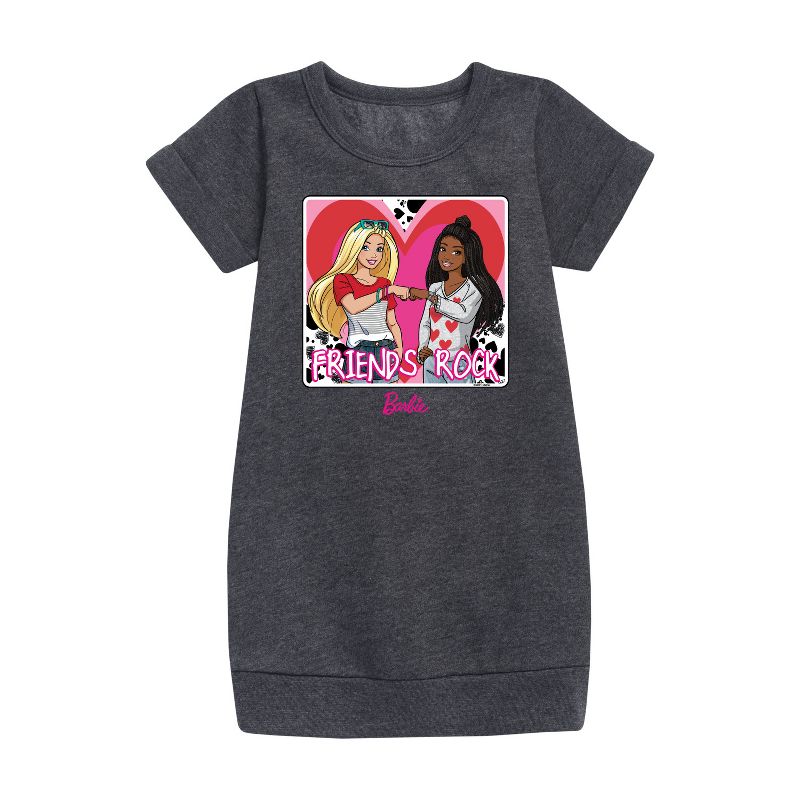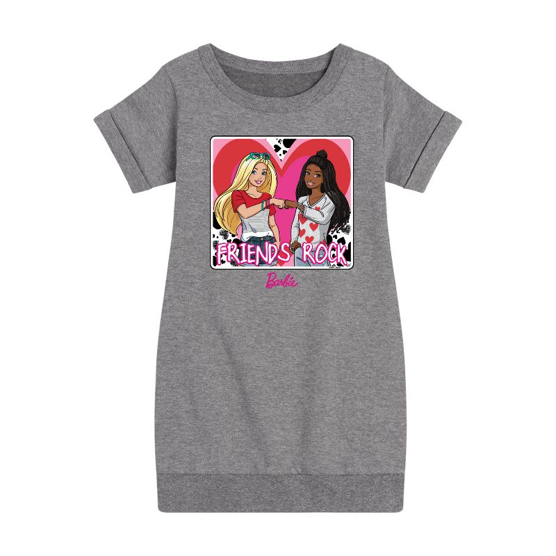 باربي - فريندز روك - فستان صوف للفتيات الصغيرات والشابات - انطلقي إلى عالم باربي الوردي الساحر مع ملابسنا المرخصة رسميًا والمُصممة خصيصًا لعشاق الموضة! سواء كنتِ تحلمين بأن تصبحي مصممة أزياء، أو أميرة حورية بحر، أو مستكشفة عالمية، فإن ملابسنا تُضفي حيوية على عالم باربي بألوانها الزاهية وطبعاتها المرحة. مصنوعة من مواد عالية الجودة مع عناية فائقة بالتفاصيل، تضمن كل قطعة الراحة والمتانة للعب طوال اليوم. عبّري عن ذوقكِ الفريد وخيالكِ مع ملابس باربي المرسومة الحصرية!