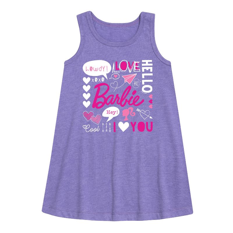 باربي - كولاج عيد الحب - فستان بقصة A للبنات الصغيرات والشابات - انطلقي إلى عالم باربي الوردي الساحر مع ملابسنا الجرافيكية المرخصة رسميًا لعشاق الموضة! سواء كنتِ تحلمين بأن تصبحي مصممة أزياء، أو أميرة حورية بحر، أو مستكشفة عالمية، فإن ملابسنا تُضفي حيوية على عالم باربي بألوانها الزاهية وطبعاتها المرحة. مصنوعة من مواد عالية الجودة مع عناية فائقة بالتفاصيل، تضمن كل قطعة الراحة والمتانة للعب طوال اليوم. عبّري عن ذوقكِ الفريد وخيالكِ مع ملابس باربي الجرافيكية الحصرية لدينا!