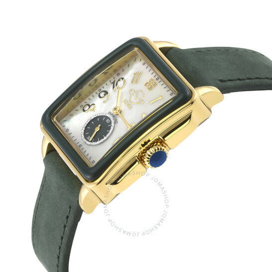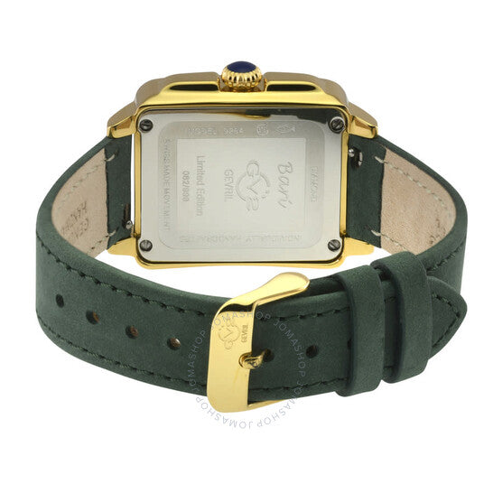 علبة من الفولاذ المقاوم للصدأ بلون الذهب الأصفر مع سوار جلدي أخضر. إطار ثابت من الفولاذ المقاوم للصدأ باللون الأسود. ميناء من عرق اللؤلؤ مع عقارب بلون الذهب الأصفر وعلامات ساعات من الألماس. علامات دقائق حول الحافة الخارجية. نوع الميناء: تناظري. ميناء فرعي واحد يعرض الثواني الصغيرة. حركة كوارتز روندا كاليبر 1069. زجاج ياقوت مقاوم للخدش. تاج قابل للسحب/الدفع. غطاء خلفي صلب. شكل العلبة مستطيل، مقاس العلبة: 34 مم، سمكها: 11 مم. عرض السوار: 18 مم. مشبك بإبزيم. مقاومة للماء حتى عمق 50 مترًا / 165 قدمًا. الوظائف: الساعات، الدقائق، الثواني الصغيرة. سلسلة باري فيفا. تصميم عصري. علامة الساعة: سويس موفنت. ساعة باري فيفا كوارتز نسائية مرصعة بالألماس GV2 من جيفريل، 9264.