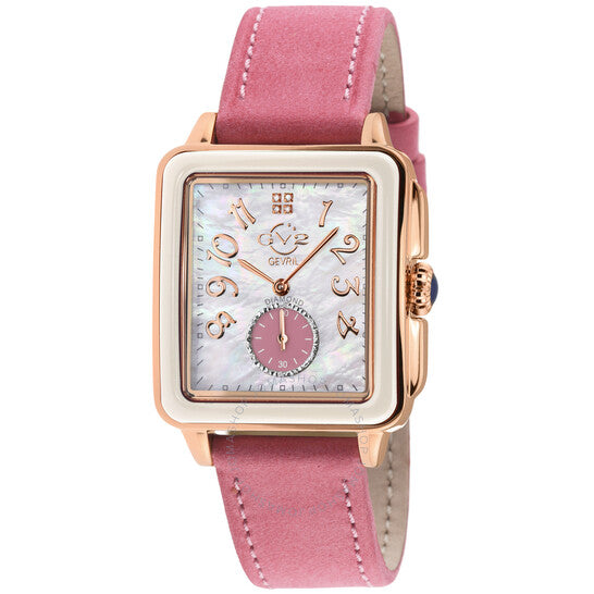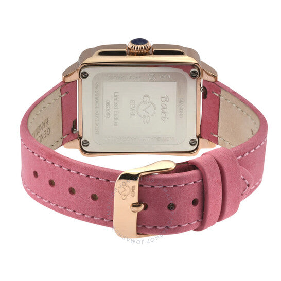 علبة من الفولاذ المقاوم للصدأ بلون الذهب الوردي مع سوار جلدي وردي. إطار ثابت من الفولاذ المقاوم للصدأ باللون الأبيض. ميناء من عرق اللؤلؤ مع عقارب بلون الذهب الوردي وعلامات ساعات من الألماس. علامات دقائق حول الحافة الخارجية. نوع الميناء: تناظري. ميناء فرعي واحد يعرض الثواني الصغيرة. حركة كوارتز روندا كاليبر 1069. زجاج ياقوت مقاوم للخدش. تاج قابل للسحب/الدفع. غطاء خلفي صلب. شكل العلبة مستطيل، مقاسها: 34 مم، سمكها: 11 مم. عرض السوار: 18 مم. مشبك بإبزيم. مقاومة للماء حتى عمق 50 مترًا / 165 قدمًا. الوظائف: الساعات، الدقائق، الثواني الصغيرة. سلسلة باري فيفا. تصميم عصري. علامة الساعة: سويس موف. ساعة باري فيفا كوارتز نسائية مرصعة بالألماس GV2 من جيفريل، 9266.