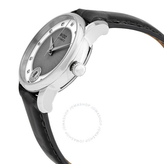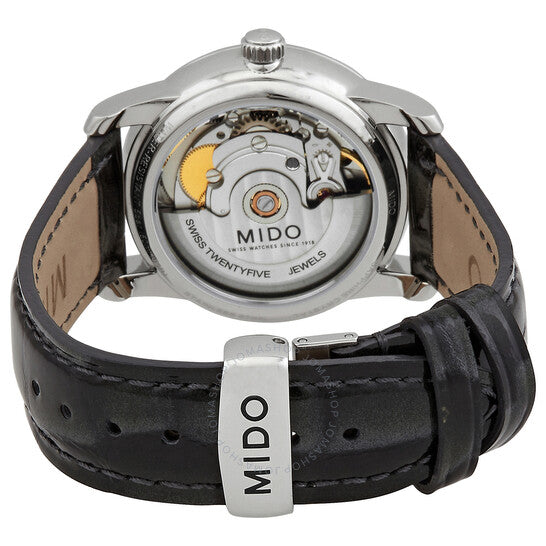 علبة من الفولاذ المقاوم للصدأ فضية اللون مع سوار جلدي أسود. إطار ثابت من الفولاذ المقاوم للصدأ فضي اللون. ميناء فضي اللون مع عقارب فضية اللون وعلامات ساعات من الألماس. نوع الميناء: تناظري. عرض التاريخ عند موضع الساعة السادسة محاط بالألماس. حركة أوتوماتيكية باحتياطي طاقة يصل إلى 40 ساعة. زجاج ياقوتي مقاوم للخدش. غطاء خلفي شفاف. شكل العلبة دائري، مقاسها: 33 مم، سمكها: 9.4 مم. مشبك بإبزيم. مقاومة للماء حتى عمق 50 مترًا / 165 قدمًا. الوظائف: التاريخ، الساعة، الدقيقة، الثانية. سلسلة بارونشيلي. طراز ساعة رسمية. علامة الساعة: صناعة سويسرية. ساعة ميدو بارونشيلي أوتوماتيكية نسائية بمينا فضي مرصعة بالألماس M0072071603601.