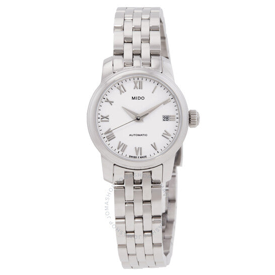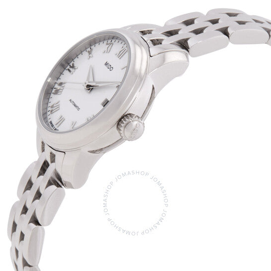علبة وسوار من الفولاذ المقاوم للصدأ فضي اللون. إطار ثابت من الفولاذ المقاوم للصدأ فضي اللون. ميناء أبيض بعقارب فضية اللون وعلامات ساعات رومانية. علامات دقائق حول الحافة الخارجية. نوع الميناء: تناظري. عرض التاريخ عند موضع الساعة 3. حركة أوتوماتيكية. زجاج ياقوت مقاوم للخدش. تاج قابل للسحب/الدفع. شكل العلبة دائري، مقاسها: 25 مم. مقاومة للماء حتى عمق 50 مترًا / 165 قدمًا. الوظائف: التاريخ، الساعة، الدقائق، الثواني. سلسلة بارونشيلي. طراز ساعة رسمية. علامة الساعة: صناعة سويسرية. ساعة ميدو بارونشيلي أوتوماتيكية نسائية بمينا أبيض M0390071101300.