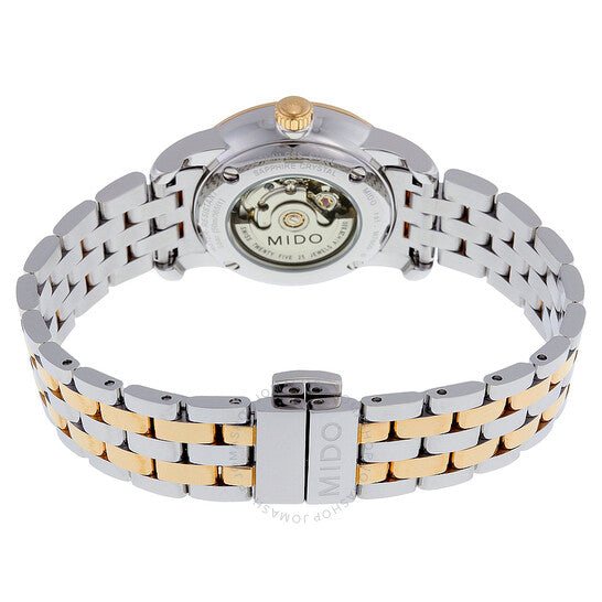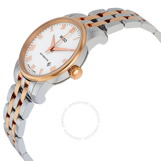 علبة من الفولاذ المقاوم للصدأ بسوار من الفولاذ المقاوم للصدأ ثنائي اللون (فضي وذهبي وردي مطلي بتقنية PVD). إطار ثابت من الذهب الوردي مطلي بتقنية PVD. ميناء أبيض بعقارب على شكل دوفين بلون ذهبي وردي وعلامات ساعات بأرقام رومانية. علامات دقائق حول الحافة الخارجية. نوع الميناء: تناظري. عرض التاريخ بين موضعي الساعة الرابعة والخامسة. حركة أوتوماتيكية من عيار ETA 2671، تحتوي على 25 جوهرة، تنبض بمعدل 28800 ذبذبة في الساعة، ولديها احتياطي طاقة لمدة 38 ساعة تقريبًا. زجاج من الياقوت المقاوم للخدش. تاج قابل للسحب/الدفع. ظهر هيكلي. شكل دائري. حجم العلبة: 29 مم. سمك العلبة: 8.65 مم. عرض السوار: 15 مم. مشبك قابل للطي بزر ضغط. مقاومة للماء حتى عمق 50 مترًا / 165 قدمًا. الوظائف: التاريخ، الساعة، الدقائق، الثواني. طراز ساعة رسمية. ملصق الساعة: صناعة سويسرية. ساعة ميدو بارونشيلي أوتوماتيكية بمينا أبيض ثنائي اللون للسيدات M76009N61.