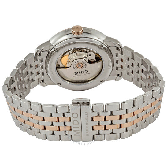 علبة من الفولاذ المقاوم للصدأ مع سوار من الفولاذ المقاوم للصدأ ثنائي اللون (فضي وذهبي وردي مطلي بتقنية PVD). إطار ثابت من الذهب الوردي مطلي بتقنية PVD. ميناء من الأنثراسايت مع عقارب على شكل دوفين بلون ذهبي وردي وعلامات ساعات مؤشرة. يظهر رقم روماني عند موضع الساعة 12. نوع الميناء: تناظري. عرض التاريخ عند موضع الساعة 6. حركة أوتوماتيكية من عيار ميدو 80 (القاعدة ETA C07.651)، تحتوي على 25 جوهرة، تنبض بمعدل 21600 ذبذبة في الساعة، ولديها احتياطي طاقة لمدة 80 ساعة تقريبًا. كريستال ياقوت مقاوم للخدش. تاج سحب/دفع. غطاء خلفي شفاف. شكل دائري. حجم العلبة: 40 مم. سمك العلبة: 10.38 مم. عرض السوار: 20 مم. مشبك فراشة. مقاومة للماء حتى عمق 30 مترًا / 100 قدم. الوظائف: تاريخ كبير، ساعة، دقيقة، ثانية. سلسلة بارونشيلي بيج ديت. تصميم ساعة كاجوال. ملصق الساعة: صناعة سويسرية. ساعة ميدو بارونشيلي الأوتوماتيكية للرجال M027.426.22.088.00.