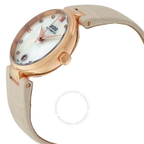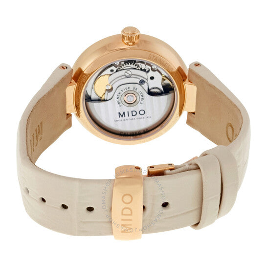 علبة من الفولاذ المقاوم للصدأ مطلية بالذهب الوردي، مطلية بتقنية PVD، مع سوار جلدي بيج. إطار ثابت من الفولاذ المقاوم للصدأ مطلي بالذهب الوردي بتقنية PVD. ميناء من عرق اللؤلؤ مع عقارب بلون الذهب الوردي وعلامات ساعات من الماس. أرقام رومانية تُشير إلى مواقع الساعات 3 و9 و12. نوع الميناء: تناظري. عرض التاريخ عند موضع الساعة 6. حركة أوتوماتيكية من ميدو، عيار باورماتيك 80 (ETA C07.611)، مع احتياطي طاقة يصل إلى 80 ساعة. زجاج ياقوت مقاوم للخدش. تاج قابل للسحب/الدفع. غطاء خلفي شفاف. شكل دائري، مقاس العلبة: 33 مم، سمكها: 10.6 مم. عرض السوار: 9.5 مم. مشبك قابل للطي. مقاومة للماء حتى عمق 50 مترًا / 165 قدمًا. الوظائف: التاريخ، الساعة، الدقيقة، الثانية. تصميم ساعة فاخر. علامة الساعة: صناعة سويسرية. ساعة ميدو بارونشيلي II أوتوماتيكية نسائية، M022.207.36.116.11.