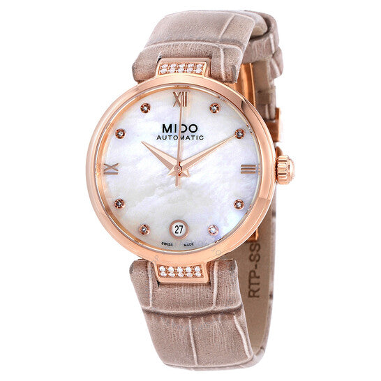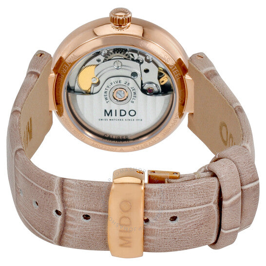 علبة من الفولاذ المقاوم للصدأ بلون الذهب الوردي مع سوار جلدي بيج. عروات مرصعة بالماس. إطار ثابت بلون الذهب الوردي. ميناء من عرق اللؤلؤ مع عقارب بلون الذهب الوردي وعلامات ساعات من الماس. أرقام رومانية تُشير إلى مواقع الساعات 3 و9 و12. نوع الميناء: تناظري. عرض التاريخ عند موضع الساعة 6. حركة أوتوماتيكية من ميدو، عيار باورماتيك 80 (ETA C07.611)، مع احتياطي طاقة يصل إلى 80 ساعة. زجاج ياقوت مقاوم للخدش. تاج قابل للسحب/الدفع. غطاء خلفي شفاف. حجم العلبة: 33 مم. سُمكها: 10.6 مم. شكلها دائري. عرض السوار: 9.50 مم. مشبك قابل للطي. مقاومة للماء حتى عمق 50 مترًا / 165 قدمًا. الوظائف: التاريخ، الساعة، الدقيقة، الثانية. تصميم ساعة فاخرة. علامة الساعة: صناعة سويسرية. ساعة ميدو بارونشيلي II أوتوماتيكية نسائية M022.207.66.116.12.