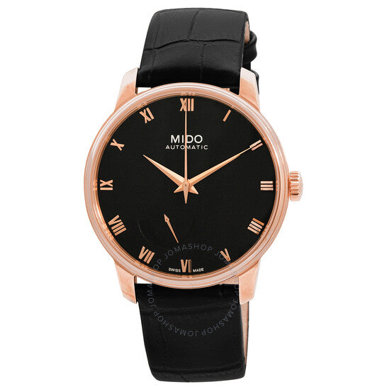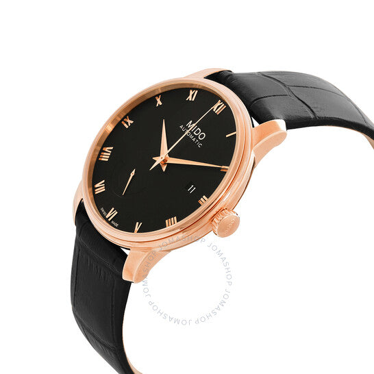 علبة من الفولاذ المقاوم للصدأ مطلية بالذهب الوردي بتقنية PVD مع سوار جلدي أسود. إطار ثابت من الفولاذ المقاوم للصدأ مطلي بالذهب الوردي بتقنية PVD. ميناء أسود بعقارب بلون الذهب الوردي وعلامات ساعات بأرقام رومانية. نوع الميناء: تناظري. عرض التاريخ عند موضع الساعة 3. ميناء فرعي واحد يعرض مؤشر احتياطي الطاقة. حركة أوتوماتيكية ETA Caliber 2897، مبنية على ETA 2892، تحتوي على 21 جوهرة، تنبض بمعدل 28800 ذبذبة في الساعة، ولديها احتياطي طاقة لمدة 42 ساعة تقريبًا. زجاج من الياقوت المقاوم للخدش. تاج قابل للسحب/الدفع. غطاء خلفي شفاف. شكل دائري، حجم العلبة: 40 مم، سمك العلبة: 9.2 مم. عرض السوار: 20 مم. مشبك قابل للطي مع مفتاح أمان. مقاومة للماء حتى عمق 30 مترًا / 100 قدم. الوظائف: التاريخ، الساعة، الدقيقة، الثانية، مؤشر احتياطي الطاقة. سلسلة Baroncelli IIIi. طراز ساعة رسمية. ملصق الساعة: صناعة سويسرية. ساعة ميدو بارونشيلي III أوتوماتيكية للرجال بمينا أسود M027.428.36.053.00.