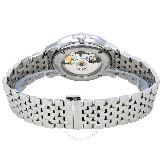 علبة من الفولاذ المقاوم للصدأ مع سوار من الفولاذ المقاوم للصدأ. إطار ثابت من الفولاذ المقاوم للصدأ. ميناء أبيض بعقارب فضية اللون على شكل دوفين وعلامات ساعات مؤشرة. علامات دقائق حول الحافة الخارجية. نوع الميناء: تناظري. عرض التاريخ عند موضع الساعة 3. حركة أوتوماتيكية من عيار ميدو باورماتيك 80 (ETA C07.621)، مبنية على ETA 2824-2، تحتوي على 23 جوهرة، تنبض بمعدل 21600 ذبذبة في الساعة، ولديها احتياطي طاقة لمدة 80 ساعة تقريبًا. زجاج ياقوتي مقاوم للخدش. تاج قابل للسحب/الدفع. غطاء خلفي شفاف. شكل دائري. حجم العلبة: 40 مم. سمك العلبة: 9.43 مم. عرض السوار: 20 مم. مشبك قابل للطي بزر ضغط. مقاومة للماء حتى عمق 30 مترًا / 100 قدم. الوظائف: التاريخ، الساعة، الدقيقة، الثانية. سلسلة بارونشيلي الثالثة. تصميم ساعة كاجوال. ملصق الساعة: صناعة سويسرية. ساعة ميدو بارونسيلي III أوتوماتيكية للرجال M027.408.11.011.00.