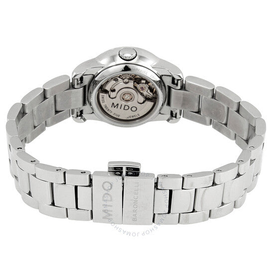 علبة من الفولاذ المقاوم للصدأ مع سوار من الفولاذ المقاوم للصدأ. إطار ثابت من الفولاذ المقاوم للصدأ. ميناء فضي اللون بعقارب فضية اللون وعلامات ساعات رومانية. علامات دقائق حول الحافة الخارجية. نوع الميناء: تناظري. عرض التاريخ عند موضع الساعة 3. حركة أوتوماتيكية. زجاج ياقوت مقاوم للخدش. تاج قابل للسحب/الدفع. غطاء خلفي شفاف. شكل دائري. حجم العلبة: 25 مم. عرض السوار: 13 مم. مشبك قابل للطي. مقاومة للماء حتى عمق 50 مترًا / 165 قدمًا. الوظائف: التاريخ، الساعة، الدقائق، الثواني. سلسلة بارونشيلي III. طراز ساعة رسمية. علامة الساعة: صناعة سويسرية. ساعة ميدو بارونشيلي III أوتوماتيكية نسائية بمينا فضي M0100071103309.