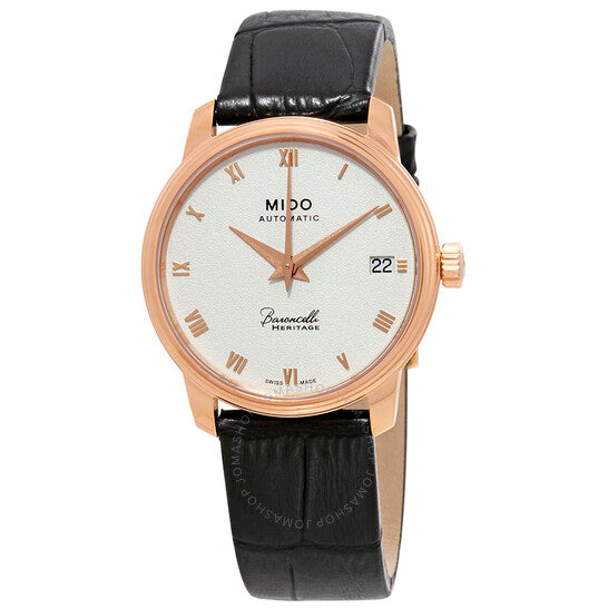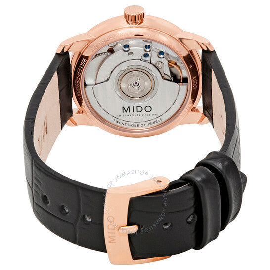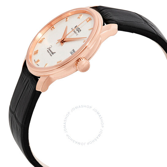 علبة من الفولاذ المقاوم للصدأ مطلية بالذهب الوردي بتقنية PVD، مع سوار جلدي أسود. إطار ثابت مطلي بالذهب الوردي بتقنية PVD. ميناء فضي اللون مع عقارب على شكل دوفين بلون الذهب الوردي، وعلامات ساعات بأرقام رومانية. نوع الميناء: تناظري. نافذة عرض التاريخ عند موضع الساعة الثالثة. حركة أوتوماتيكية من عيار ETA 2892-A2، مبنية على ETA 2890، تحتوي على 21 جوهرة، تنبض بتردد 28800 ذبذبة في الساعة، وتحتفظ باحتياطي طاقة يدوم لحوالي 42 ساعة. زجاج من الياقوت المقاوم للخدش. تاج قابل للسحب/الدفع. غطاء خلفي شفاف. شكل دائري. حجم العلبة: 33 مم. سمكها: 6.85 مم. عرض السوار: 17 مم. مشبك قابل للطي بزر ضغط. مقاومة للماء حتى عمق 30 مترًا / 100 قدم. الوظائف: التاريخ، الساعة، الدقيقة، الثانية. تصميم كاجوال. علامة الساعة: صناعة سويسرية. ساعة ميدو بارونشيلي III أوتوماتيكية للسيدات بمينا فضي M0272073601300.