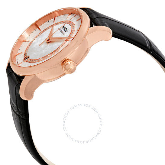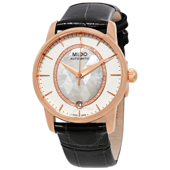 علبة من الفولاذ المقاوم للصدأ مطلية بالذهب الوردي بتقنية PVD مع سوار جلدي أسود. إطار ثابت مطلي بالذهب الوردي بتقنية PVD. ميناء من عرق اللؤلؤ (مرصع بالألماس) مع عقارب على شكل دوفين بلون الذهب الوردي وعلامات ساعات مؤشرة. علامات دقائق حول الحافة الخارجية. نوع الميناء: تناظري. نافذة عرض التاريخ عند موضع الساعة السادسة. حركة أوتوماتيكية من عيار ETA C07.611، تحتوي على 25 جوهرة، تنبض بتردد 21600 ذبذبة في الساعة، ولديها احتياطي طاقة يصل إلى 80 ساعة تقريبًا. زجاج من الياقوت المقاوم للخدش. تاج قابل للسحب/الدفع. غطاء خلفي شفاف. شكل دائري. حجم العلبة: 33 مم. سمكها: 9.4 مم. عرض السوار: 18 مم. مشبك قابل للطي. مقاومة للماء حتى عمق 50 مترًا / 165 قدمًا. الوظائف: التاريخ، الساعة، الدقائق، الثواني. سلسلة بارونشيلي بريزما. تصميم كاجوال. علامة الساعة: صناعة سويسرية. ساعة ميدو بارونشيلي بريزما أوتوماتيكية للسيدات M007.207.36.116.00.