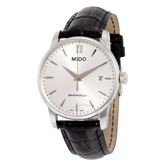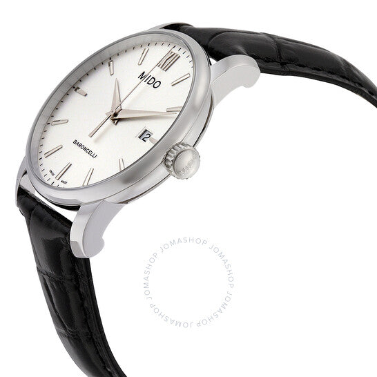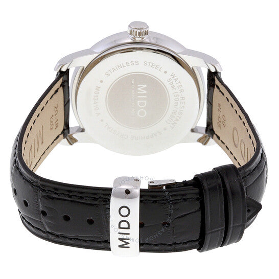 علبة من الفولاذ المقاوم للصدأ مع سوار جلدي أسود. إطار ثابت من الفولاذ المقاوم للصدأ. ميناء فضي اللون بعقارب فضية اللون وعلامات ساعات. يظهر رقم روماني عند موضع الساعة ١٢. علامات دقائق حول الحافة الخارجية. نوع الميناء: تناظري. عرض التاريخ عند موضع الساعة ٣. حركة كوارتز. كريستال ياقوتي مقاوم للخدش. غطاء خلفي صلب. قطر العلبة: ٣٨ مم. سُمكها: ٧.٠٧ مم. شكلها دائري. عرض السوار: ١٨ مم. مشبك تانغ. مقاومة للماء حتى عمق ٥٠ مترًا / ١٦٥ قدمًا. معلومات إضافية: eol. تصميم ساعة كاجوال. علامة الساعة: صناعة سويسرية. ساعة ميدو بارونشيلي للرجال بمينا فضي وجلد أسود، رقم الموديل M0134101603100.