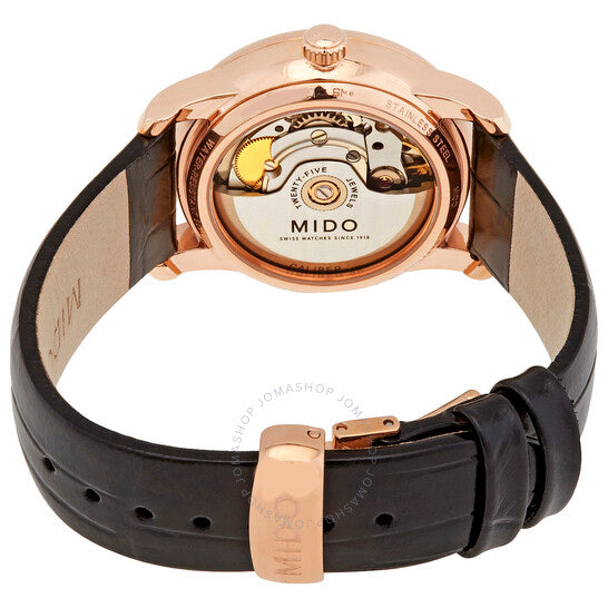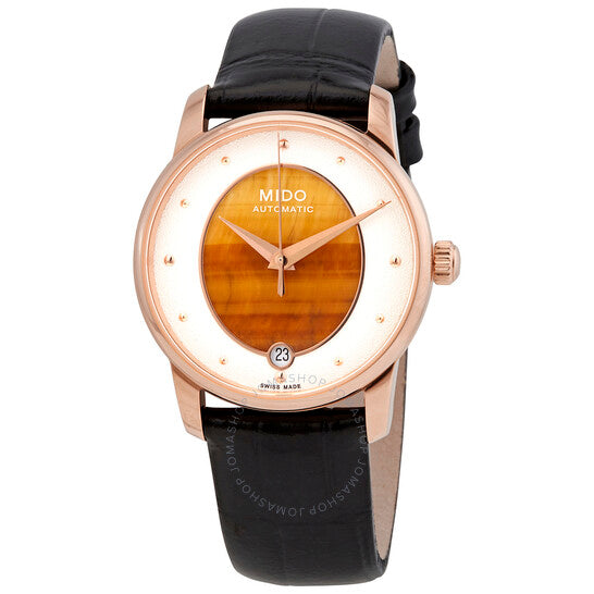 علبة من الفولاذ المقاوم للصدأ مطلية بالذهب الوردي بتقنية PVD، مع سوار جلدي أسود. إطار ثابت مطلي بالذهب الوردي بتقنية PVD. ميناء أبيض (حجر عين النمر) بعقارب على شكل دوفين بلون الذهب الوردي وعلامات ساعات منقطة. نوع الميناء: تناظري. نافذة عرض التاريخ عند موضع الساعة السادسة. حركة أوتوماتيكية من عيار ميدو باورماتيك 80 (ETA C07.611)، مبنية على ETA 2824-2، تحتوي على 23 جوهرة، تنبض بتردد 21600 ذبذبة في الساعة، وتحتفظ باحتياطي طاقة يدوم حوالي 80 ساعة. زجاج ياقوتي مقاوم للخدش. غطاء خلفي شفاف. شكل دائري. حجم العلبة: 33 مم. سمكها: 9.75 مم. مشبك قابل للطي. مقاومة للماء حتى عمق 50 مترًا / 165 قدمًا. الوظائف: التاريخ، الساعة، الدقيقة، الثانية. سلسلة بارونشيلي وايلد ستون. تصميم ساعة كاجوال. علامة الساعة: صناعة سويسرية. ساعة ميدو بارونشيلي وايلد ستون أوتوماتيكية للسيدات M0352073647100.