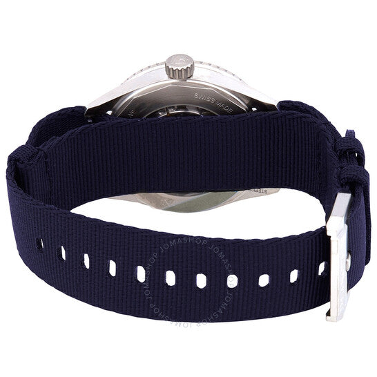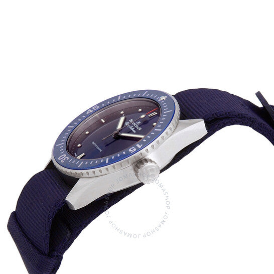 علبة من الفولاذ المقاوم للصدأ مع سوار من قماش ناتو أزرق. إطار دوار أحادي الاتجاه من الفولاذ المقاوم للصدأ بحافة عملة معدنية وحلقة سيراميك زرقاء (للعد التصاعدي للوقت المنقضي). ميناء أزرق مع عقارب مضيئة فضية اللون وعلامات ساعات منقطة. علامات دقائق حول الحافة الخارجية. نوع الميناء: تناظري. عقارب وعلامات مضيئة. عرض التاريخ بين موضعي الساعة 4 و5. حركة أوتوماتيكية من عيار بلانكبان 1150، تحتوي على 28 جوهرة، مكونة من 210 أجزاء، تنبض بمعدل 21600 ذبذبة في الساعة، ولديها احتياطي طاقة يصل إلى 100 ساعة تقريبًا. زجاج من الياقوت المقاوم للخدش. تاج لولبي. غطاء خلفي شفاف. شكل العلبة دائري، حجم العلبة: 38 مم. سمك العلبة: 11.00 مم. عرض السوار: 20.00 مم. مشبك تانغ. مقاومة للماء حتى عمق 300 متر / 1000 قدم. الوظائف: التاريخ، الساعة، الدقائق، الثواني. سلسلة باثي سكوب. طراز ساعة الغوص. علامة الساعة: صناعة سويسرية. ساعة بلانكبان باثيسكاف أوتوماتيكية للرجال بمينا زرقاء رقم 5100-1140-NAOA.