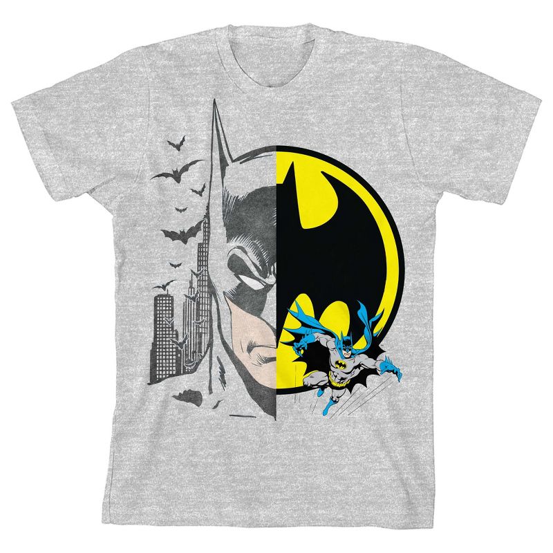 - تيشيرت برسومات جرافيكية: يحتفي هذا القميص بكل ما يتعلق بباتمان بفن تقسيم فريد. يُظهر أحد الجانبين رسمًا تخطيطيًا لوجه باتمان مع مدينة جوثام في الخلفية، بينما يُظهر الجانب الآخر إشارة باتمان مع البطل الخارق وهو ينزلق أسفلها.
