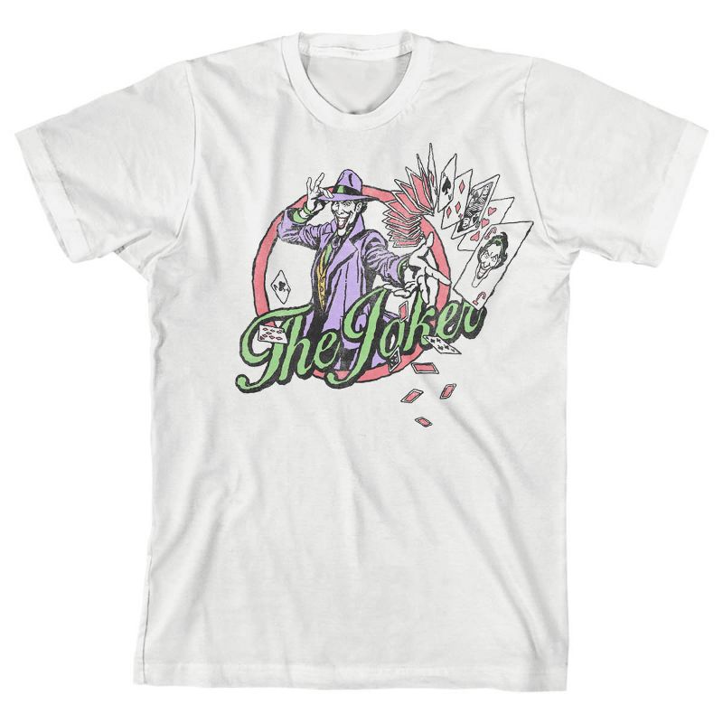 - تيشيرت برسومات جرافيكية: يتميز هذا التيشيرت الصبياني بشخصية الجوكر، عدو باتمان اللدود، وهو يخرج من دائرة حمراء ويطلق أوراق لعب ملتهبة ذات حواف حادة. تُكتب أحرف خضراء بخط مائل اسم الجوكر.