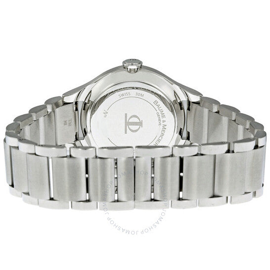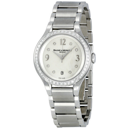 علبة وسوار من الفولاذ المقاوم للصدأ مصقولان/ساتانيان. إطار ثابت مرصع بالألماس. ميناء من عرق اللؤلؤ مزخرف بمنحنى، مع عقارب فضية اللون وعلامات ساعات من الألماس. أرقام عربية تُشير إلى الأرقام 3 و9 و12. يعرض التاريخ عند موضع الساعة 6. حركة كوارتز. زجاج ياقوت مقاوم للخدش. تاج فولاذي مرصع بماسة واحدة. غطاء خلفي صلب. قطر العلبة: 30 مم. سُمكها: 8.5 مم. مشبك ثلاثي الطي. مقاومة للماء حتى عمق 30 مترًا/100 قدم. معلومات إضافية: ساعة بوم آند ميرسييه إيليا النسائية 8772، وزنها 0.62 قيراط. إصدارات المنتج: MOA8772، M0A08772، 8772، 08772