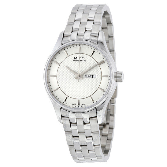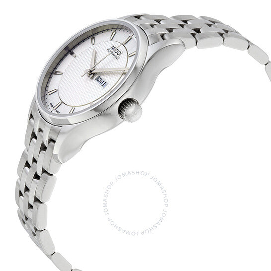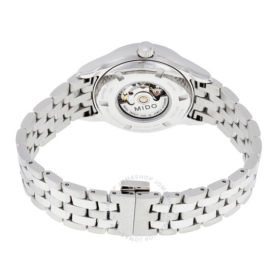 علبة من الفولاذ المقاوم للصدأ مع سوار من الفولاذ المقاوم للصدأ. إطار ثابت من الفولاذ المقاوم للصدأ. ميناء فضي اللون بعقارب فضية اللون وعلامات ساعات. علامات دقائق حول الحافة الخارجية. نوع الميناء: تناظري. عرض يوم الأسبوع والتاريخ عند موضع الساعة الثالثة. حركة أوتوماتيكية من عيار ETA 2678، مبنية على ETA 2671، تحتوي على 25 جوهرة، تنبض بمعدل 28800 ذبذبة في الساعة، ولديها احتياطي طاقة لمدة 38 ساعة تقريبًا. زجاج من الياقوت المقاوم للخدش. تاج لولبي. غطاء خلفي شفاف. شكل دائري. حجم العلبة: 33 مم. سمكها: 10.45 مم. عرض السوار: 16 مم. مشبك قابل للطي. مقاومة للماء حتى عمق 100 متر / 330 قدمًا. الوظائف: التاريخ، اليوم، الساعة، الدقيقة، الثانية. تصميم ساعة كاجوال. علامة الساعة: صناعة سويسرية. ساعة ميدو بيلونا أوتوماتيكية نسائية بمينا فضي M0012301103191.