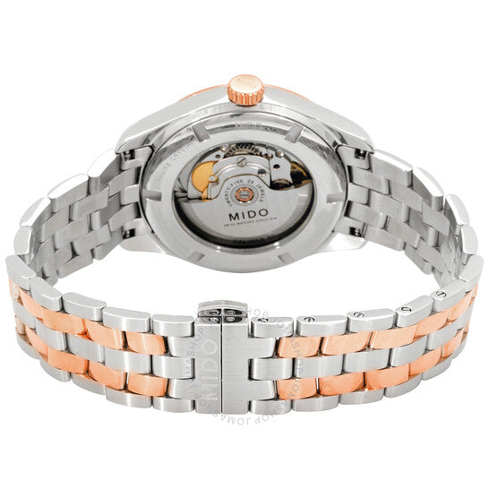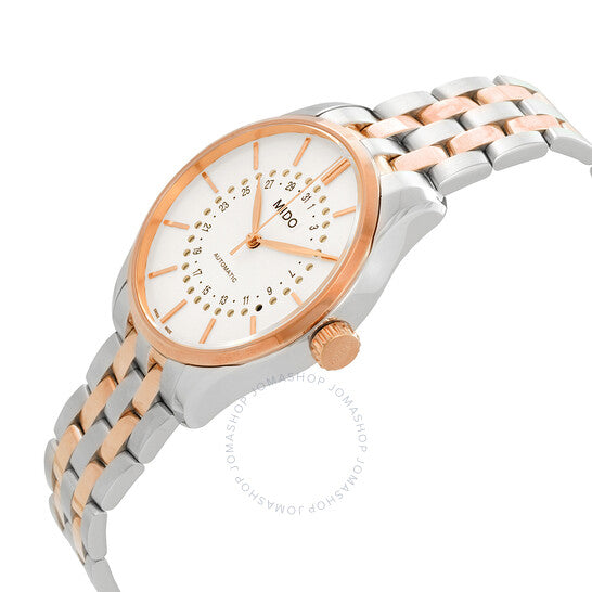 علبة من الفولاذ المقاوم للصدأ فضية اللون، مع سوار من الفولاذ المقاوم للصدأ ثنائي اللون (فضي وذهبي وردي مطلي بتقنية PVD). إطار ثابت من الفولاذ المقاوم للصدأ مطلي بالذهب الوردي بتقنية PVD. ميناء فضي اللون مع عقارب ومؤشرات ساعات ذهبية وردية اللون. نوع الميناء: تناظري. ميدو كاليبر باورماتيك 80 COSC (قاعدة ETA C07.621 حركة أوتوماتيكية، مبنية على ETA C07.621، تحتوي على 25 جوهرة، تنبض بسرعة 21600 ذبذبة في الساعة، ولديها احتياطي طاقة لمدة 80 ساعة تقريبًا. كريستال الياقوت المقاوم للخدش. غطاء شفاف. شكل العلبة دائري، حجم العلبة: 40 مم، سمك العلبة: 11 مم. عرض السوار: 20 مم. مشبك قابل للطي بزر ضغط. مقاومة للماء حتى عمق 50 مترًا / 165 قدمًا. الوظائف: التاريخ والساعة والدقيقة والثانية. سلسلة بيلونا II. نمط ساعة رسمية. ملصق الساعة: صنع سويسري. ميدو بيلونا II ساعة رجالية أوتوماتيكية بمينا فضية M0244072203109.