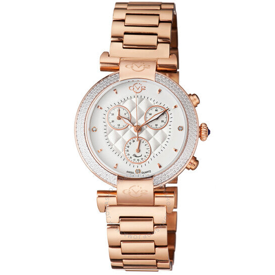 علبة من الفولاذ المقاوم للصدأ مع سوار من الفولاذ المقاوم للصدأ باللون الذهبي الوردي. إطار ثابت فضي اللون مرصع بالألماس. ميناء أبيض بعقارب ذهبية اللون وعلامات ساعات. علامات دقائق حول الحافة الداخلية. نوع الميناء: تناظري. عقارب مضيئة. عرض التاريخ عند موضع الساعة السادسة. كرونوغراف - ثلاثة أقراص فرعية تعرض: 60 ثانية، 30 دقيقة، والتاريخ. حركة كوارتز ISA Caliber 8171/202. زجاج ياقوت مقاوم للخدش ومضاد للانعكاس. حجم العلبة: 37 مم. سمكها: 9.1 مم. شكلها دائري. طول السوار: 7.5 بوصة. مشبك قابل للطي. مقاومة للماء حتى عمق 30 مترًا / 100 قدم. الوظائف: كرونوغراف، تاريخ، ساعة، دقيقة، ثانية. طراز ساعة رسمية. علامة الساعة: صناعة سويسرية. ساعة بيرليتا GV2 كرونوغراف نسائية بمينا بيضاء مرصعة بالألماس، طراز 1552.