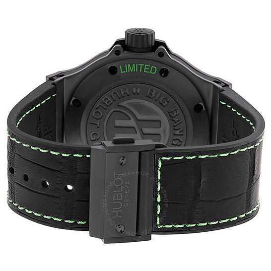 علبة من السيراميك الأسود مع سوار مطاطي أسود. إطار دوار من السيراميك الأسود. ميناء أسود بعقارب خضراء مضيئة وعلامات ساعات. علامات دقائق حول الحافة الخارجية. نوع الميناء: تناظري. عقارب وعلامات مضيئة. يظهر عرض التاريخ عند موضع الساعة 3. حركة أوتوماتيكية باحتياطي طاقة لمدة 42 ساعة. زجاج من الياقوت المقاوم للخدش. تاج قابل للسحب/الدفع. غطاء خلفي هيكلي. قطر العلبة: 48 مم. شكلها دائري. مشبك قابل للطي. مقاومة للماء حتى عمق 300 متر/1000 قدم. الوظائف: الساعات، الدقائق، الثواني، التقويم. معلومات إضافية: إصدار محدود من 500 قطعة. تصميم ساعة فاخر. علامة الساعة: صناعة سويسرية. إصدارات الساعة: 322 CI 1190 GR ABG11، 322-CI-1190-GR-ABG11، 322CI1190GRABG11. ساعة هوبلو بيغ بانغ أول بلاك جرين للرجال 322.CI.1190.GR.ABG11.