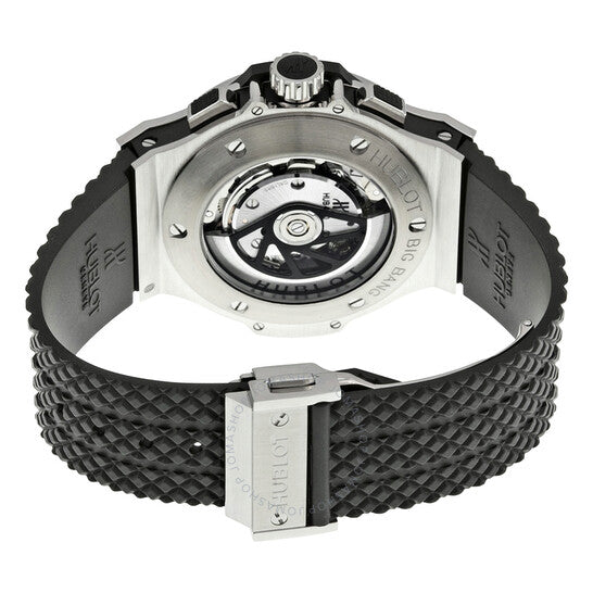 علبة من الفولاذ المقاوم للصدأ مع لمسات جانبية سوداء من كيفلر وسوار مطاطي أسود. إطار ثابت من الفولاذ المقاوم للصدأ. ميناء أسود بعقارب هيكلية فضية مضيئة، وأرقام عربية وعلامات ساعات متناوبة. علامات دقائق حول الحافة الخارجية. نوع الميناء: تناظري. عقارب وعلامات مضيئة. عرض التاريخ بين موضعي الساعة الرابعة والخامسة. كرونوغراف - ثلاثة أقراص فرعية تعرض: ١٢ ساعة، ٣٠ دقيقة، ثواني صغيرة. حركة أوتوماتيكية من عيار هوبلو HUB4100، مبنية على ETA 2894-2، تحتوي على ٢٧ جوهرة، مكونة من ٢٥٢ جزءًا، تنبض بتردد ٢٨٨٠٠ ذبذبة في الساعة، ولديها احتياطي طاقة لمدة ٤٢ ساعة تقريبًا. زجاج ياقوت مقاوم للخدش. تاج قابل للسحب/الدفع. غطاء خلفي شفاف. شكل دائري. حجم العلبة: ٤٤ مم. سمك العلبة: ١٤.٥ مم. عرض السوار: ٢٥ مم. طول السوار: ٨.٥ بوصة. مشبك قابل للطي. مقاومة للماء حتى عمق ١٠٠ متر / ٣٣٠ قدمًا. الوظائف: كرونوغراف، تاريخ، ساعات، دقائق، ثوانٍ. طراز ساعة رسمية. علامة الساعة: صناعة سويسرية. إصدارات متنوعة: ٣٠١.SX.١٣٠.RX، ٣٠١-SX-١٣٠-RX، ٣٠١/SX/١٣٠/RX، ٣٠١SX١٣٠RX. ساعة هوبلو بيغ بانغ أوتوماتيكية ٤٤ مم للرجال ٣٠١.SX.١٣٠.RX.