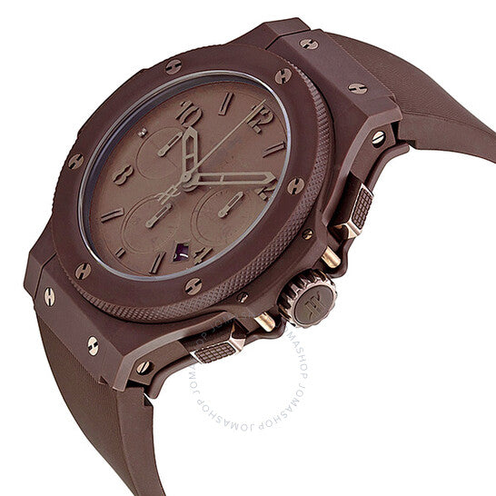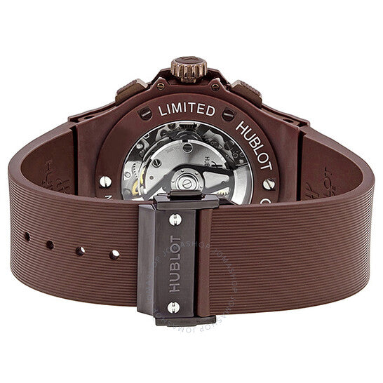 علبة سيراميك بنية مطلية بتقنية PVD مع سوار مطاطي. إطار ثابت بني مطلي بتقنية PVD. ميناء بني شوكولاتة مع عقارب بنية وأرقام عربية متناوبة وعلامات ساعات على شكل عصا. علامات دقائق حول الحافة الخارجية. يعرض التاريخ بين موضعي الساعة الرابعة والخامسة. كرونوغراف - ثلاثة أقراص فرعية تعرض: ٦٠ ثانية، ٣٠ دقيقة، وعُشر الثانية. حركة أوتوماتيكية. كريستال ياقوتي مقاوم للخدش. تاج فولاذي بني مطلي بتقنية PVD. غطاء خلفي هيكلي من كريستال ياقوتي. قطر العلبة: ٤٤ مم. سُمكها: ١٤.٥ مم. مشبك قابل للطي بني مطلي بتقنية PVD. مقاومة للماء حتى عمق ٣٠ مترًا / ١٠٠ قدم. الوظائف: كرونوغراف / تاريخ / ساعة / دقيقة / ثانية. ساعة هوبلو بيغ بانغ الرجالية، إصدار محدود، ٣٠١.CC.٣١٩٠.RC.