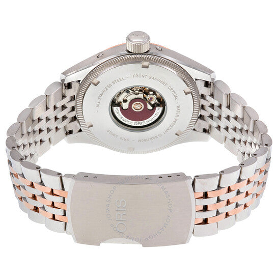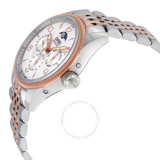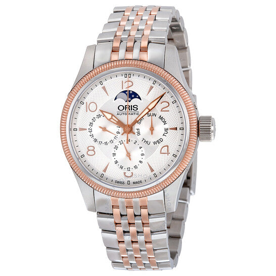 علبة من الفولاذ المقاوم للصدأ مع سوار من الفولاذ المقاوم للصدأ ثنائي اللون (فضي وذهبي وردي مطلي بتقنية PVD). إطار ثابت مُخدّد مطلي بتقنية PVD من الذهب الوردي. ميناء فضي مع عقارب مضيئة بلون الذهب الوردي، وأرقام عربية وعلامات ساعات متناوبة. علامات دقائق حول الحافة الخارجية. نوع الميناء: تناظري. عقارب وعلامات مضيئة. ثلاثة أقراص فرعية متعددة الوظائف تعرض: ٢٤ ساعة، التاريخ، ويوم الأسبوع. حركة أوتوماتيكية باحتياطي طاقة ٣٨ ساعة. زجاج ياقوت مقاوم للخدش. غطاء خلفي شفاف. قطر العلبة: ٤٠ مم. سُمكها: ١١ مم. شكلها دائري. مشبك قابل للطي. مقاومة للماء حتى عمق ١٠٠ متر / ٣٣٠ قدمًا. الوظائف: التاريخ، اليوم، الساعة، الدقيقة، الثانية، مؤشر أطوار القمر، كرونوغراف. تصميم ساعة كاجوال. علامة الساعة: صناعة سويسرية. ساعة أوريس بيج كراون كومبليكيشن للرجال بمينا فضي وسوار من الفولاذ المقاوم للصدأ ثنائي اللون 01 582 7678 4361-07 8 20 32.