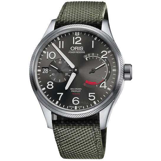 علبة فضية اللون من الفولاذ المقاوم للصدأ مع سوار قماشي أخضر. إطار ثابت من الفولاذ المقاوم للصدأ فضي اللون. ميناء رمادي اللون بعقارب فضية اللون وعلامات ساعات بأرقام عربية. علامات دقائق حول الحافة الخارجية. نوع الميناء: تناظري. عقارب وعلامات مضيئة. عرض التاريخ عند موضع الساعة التاسعة. ميناءان فرعيان يعرضان: 60 ثانية ومؤشر احتياطي الطاقة. حركة أوريس كاليبر 111 يدوية التعبئة، تحتوي على 40 جوهرة، تنبض بتردد 21600 ذبذبة في الساعة، وتحتفظ باحتياطي طاقة يقارب 240 ساعة. زجاج من الياقوت المقاوم للخدش. تاج لولبي. غطاء خلفي شفاف. شكل العلبة دائري، مقاسها 44 مم. مشبك قابل للطي. مقاومة للماء حتى عمق 100 متر / 330 قدمًا. الوظائف: ساعة، دقيقة، ثانية صغيرة، مؤشر احتياطي الطاقة. سلسلة بيج كراون. تصميم ساعة كاجوال. علامة الساعة: سويسرية الصنع. ساعة أوريس بيج كراون رمادية اللون للرجال 01 111 7711 4163-07 5 22 14FC.