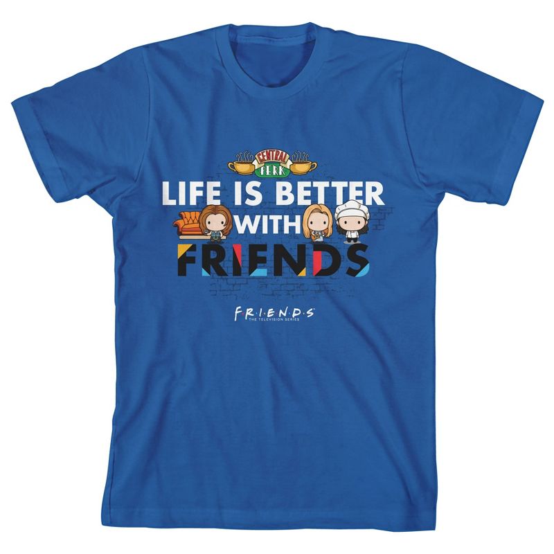 - تيشيرت برسومات جرافيكية: تقف شخصيات تشيبي من مسلسل "فريندز" الكوميدي خلف حروف بيضاء وسوداء تُهجّى عبارة "الحياة أفضل مع الأصدقاء" في التصميم الجرافيكي لهذا التيشيرت. يُعد هذا التيشيرت هدية رائعة لعشاق مسلسل "فريندز".