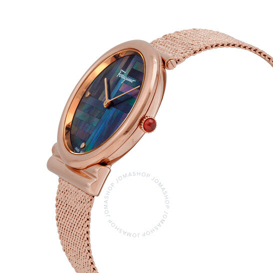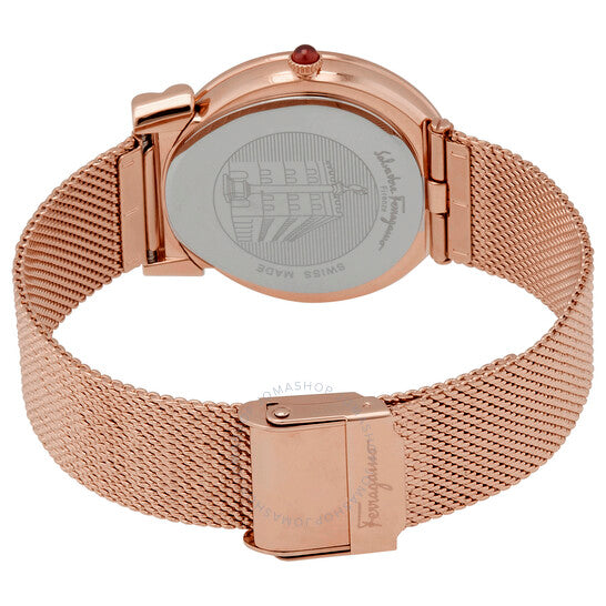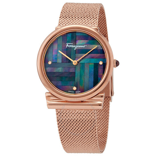 علبة من الفولاذ المقاوم للصدأ بلون الذهب الوردي، وسوار شبكي من الفولاذ المقاوم للصدأ بلون الذهب الوردي. إطار ثابت بلون الذهب الوردي. ميناء أسود من عرق اللؤلؤ مع عقارب بلون الذهب الوردي. أحجار ألماس عند مواضع الساعة 3 و6 و9. نوع الميناء: تناظري. حركة كوارتز. زجاج ياقوت مقاوم للخدش. تاج قابل للسحب/الدفع. غطاء خلفي صلب. شكل دائري، مقاس العلبة: 34 مم، سمكها: 6.5 مم. عرض السوار: 18 مم. مشبك قابل للطي. مقاومة للماء حتى عمق 30 مترًا / 100 قدم. الوظائف: الساعات، الدقائق. طراز ساعة رسمية. علامة الساعة: صناعة سويسرية. ساعة فيراغامو نسائية بمينا أسود من عرق اللؤلؤ SFIY00819.