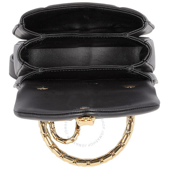 حقيبة كتف نسائية من بولغاري. رمز المنتج: 292126. الرمز الشريطي: 8052749243684. اللون: أسود. المقاس: 7.9 × 5.5 × 3.9 بوصة. حقيبة بولغاري سيربنتي ريفرس الجلدية السوداء بمقبض علوي رقم 292126. مصنوعة من جلد عجل متروبوليتان أسود مبطن، ومزينة بقفل مغناطيسي على شكل رأس ثعبان مستوحى من ساعة بولغاري من ستينيات القرن الماضي. تتميز بمقبض علوي معدني على شكل ثعبان وحزام من الجلد بسلسلة، وثلاثة جيوب، وجيبين داخليين منفصلين، وجيب خلفي منفصل. الخامة: جلد عجل 100%. صنع في إيطاليا.