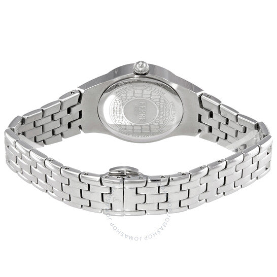 علبة من الفولاذ المقاوم للصدأ مع سوار من الفولاذ المقاوم للصدأ. إطار ثابت من الفولاذ المقاوم للصدأ. ميناء أزرق من عرق اللؤلؤ مع عقارب وعلامات ساعات فضية اللون. علامات دقائق حول الحافة الخارجية. نوع الميناء: تناظري. حركة كوارتز. زجاج معدني مقاوم للخدش. تاج ضغط/سحب. شكل العلبة دائري. حجم العلبة: 30 مم. سمكها: 8 مم. عرض السوار: 14 مم. طول السوار: 7.5 بوصة. مشبك قابل للطي. مقاومة للماء حتى عمق 50 مترًا / 165 قدمًا. الوظائف: الساعات، الدقائق، الثواني. تصميم كاجوال. علامة الساعة: صناعة سويسرية. ساعة فيري ميلانو نسائية بمينا أزرق من عرق اللؤلؤ FM1L089M0051