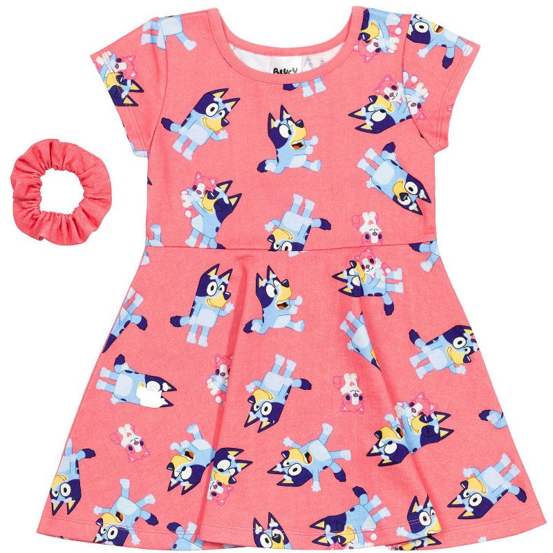 - فستان قصير الأكمام لطيف وأنيق للفتيات الصغيرات من Bluey مرخص رسميًا مع رباط شعر مطاطي
