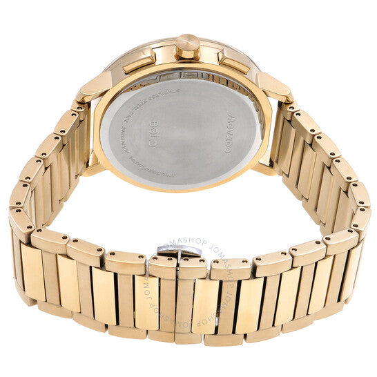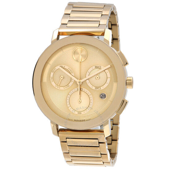 علبة من الفولاذ المقاوم للصدأ مع سوار ذهبي اللون. إطار ثابت من الفولاذ المقاوم للصدأ. ميناء ذهبي اللون. نوع الميناء: تناظري. عرض التاريخ عند موضع الساعة الرابعة. كرونوغراف - ثلاثة أقراص فرعية لعرض: ٦٠ ثانية، ٣٠ دقيقة، و١٢ ساعة. حركة كوارتز. غطاء خلفي صلب. شكل العلبة دائري، مقاسها: ٤٢ مم. مشبك قابل للطي مع مفتاح أمان. مقاومة للماء حتى عمق ٣٠ مترًا / ١٠٠ قدم. الوظائف: كرونوغراف، تاريخ، ساعة، دقيقة، ثانية. سلسلة بولد إيفولوشن ٢.٠. ساعة كاجوال. علامة الساعة: صناعة سويسرية. ساعة موفادو بولد إيفولوشن ٢.٠ كرونوغراف كوارتز للرجال ٣٦٠١٠٩٨.