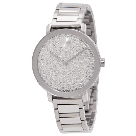 علبة وسوار من الفولاذ المقاوم للصدأ فضي اللون. إطار ثابت من الفولاذ المقاوم للصدأ فضي اللون. ميناء فضي اللون مرصع بالكريستال وعقارب فضية اللون. نقشة نقطية مميزة عند الساعة ١٢. نوع الميناء: تناظري. حركة كوارتز. كريستال K1 مقاوم للخدش. تاج قابل للسحب/الدفع. غطاء خلفي صلب. شكل دائري، مقاس العلبة: ٣٤ مم. مشبك قابل للطي مع مفتاح أمان. مقاومة للماء حتى عمق ٣٠ مترًا / ١٠٠ قدم. الوظائف: الساعات، الدقائق. سلسلة بولد إيفولوشن ٢.٠. تصميم كاجوال. علامة الساعة: صناعة سويسرية. ساعة موفادو بولد إيفولوشن ٢.٠ كوارتز نسائية ٣٦٠١١٥١.