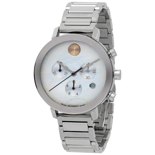 علبة وسوار من الفولاذ المقاوم للصدأ فضي اللون. إطار ثابت من الفولاذ المقاوم للصدأ فضي اللون. ميناء من عرق اللؤلؤ مع عقارب فضية اللون وعلامات ساعات. نوع الميناء: تناظري. عرض التاريخ عند موضع الساعة الرابعة. كرونوغراف - ثلاثة أقراص فرعية تعرض: ٦٠ ثانية، ٣٠ دقيقة، وعُشر الثانية. آلية حركة كوارتز. كريستال K1 مقاوم للخدش. تاج قابل للسحب/الدفع. غطاء خلفي صلب. شكل دائري، مقاس العلبة: ٣٨ مم. مشبك قابل للطي. مقاومة للماء حتى عمق ٣٠ مترًا / ١٠٠ قدم. الوظائف: كرونوغراف، تاريخ، ساعة، دقيقة، ثانية. سلسلة بولد إيفولوشن. طراز ساعة رسمية. علامة الساعة: صناعة سويسرية. ساعة موفادو بولد إيفولوشن كرونوغراف كوارتز نسائية ٣٦٠٠٧٨٧.