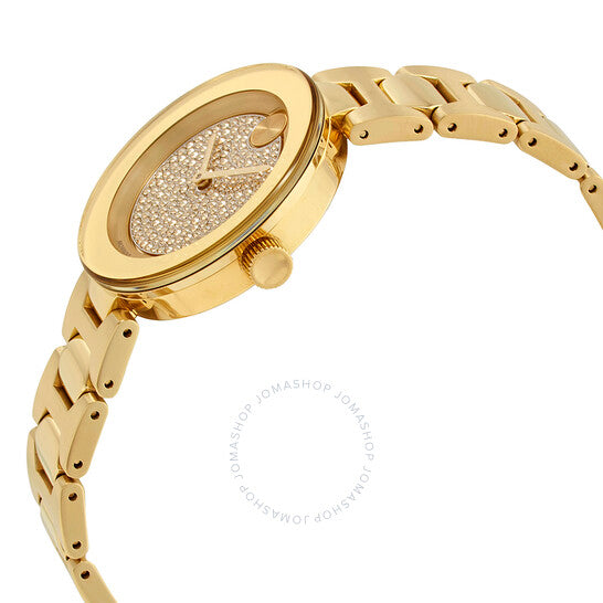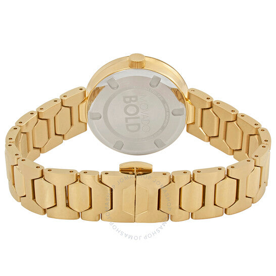 علبة وسوار من الفولاذ المقاوم للصدأ مطليان بالذهب الباهت. إطار ثابت مطلي بالذهب الباهت. ميناء من كريستال الشمبانيا المرصع بالكريستال مع عقارب ذهبية صفراء. بدون علامات. تظهر نقطة موفادو عند موضع الساعة ١٢. نوع الميناء: تناظري. حركة كوارتز. كريستال معدني K1 مقاوم للخدش. تاج قابل للسحب/الدفع. غطاء خلفي صلب. شكل دائري. حجم العلبة: ٣٢ مم. سمكها: ٨ مم. عرض السوار: ١٤ مم. طول السوار: ٧ بوصات. مشبك قابل للطي. مقاومة للماء حتى عمق ٣٠ مترًا / ١٠٠ قدم. الوظائف: الساعات، الدقائق. طراز ساعة رسمية. ساعة موفادو بولد بورد بكريستال مرصع للسيدات، رقم ٣٦٠٠٤٩٢.