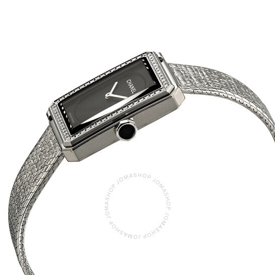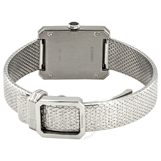 علبة من الفولاذ المقاوم للصدأ مع سوار فضي اللون (بنقش تويد). إطار ثابت من الفولاذ المقاوم للصدأ مرصع بـ 62 ماسة. ميناء أسود مزخرف بنقش غيوشيه مع عقارب فضية اللون. بدون مؤشرات. نوع الميناء: تناظري. حركة كوارتز. زجاج ياقوت مقاوم للخدش. تاج قابل للسحب/الدفع. غطاء خلفي صلب. شكل العلبة مستطيل، أبعادها: 27.9 مم × 21.5 مم. سُمكها: 6.2 مم. مشبك سهل الفتح. مقاومة للماء حتى عمق 30 مترًا / 100 قدم. الوظائف: الساعات، الدقائق. معلومات إضافية: إطار مرصع بـ 62 ماسة بقطع بريانت (~0.37 قيراط). طراز ساعة فاخرة. علامة الساعة: صناعة سويسرية. ساعة شانيل بوي فريند نسائية بمينا سوداء H4877.