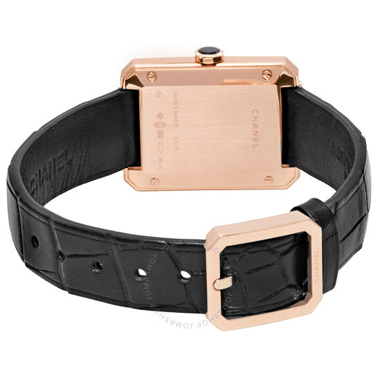 علبة من الذهب البيج عيار ١٨ قيراطًا مع سوار من جلد التمساح الأسود. إطار ثابت. ميناء من الأوبالين مُزخرف بنقشة غيوشيه مع عقارب بلون الذهب الوردي. نوع الميناء: تناظري. حركة كوارتز. هيكل مستطيل الشكل، أبعاده: ٢٧.٩ × ٢١.٥ مم، سُمكه: ٦.٢ مم. مقاومة للماء حتى عمق ٣٠ مترًا / ١٠٠ قدم. وظائفه: الساعات والدقائق. تصميم فاخر. علامة الساعة: صناعة سويسرية. ساعة شانيل بوي فريند النسائية من الذهب البيج عيار ١٨ قيراطًا H4886.