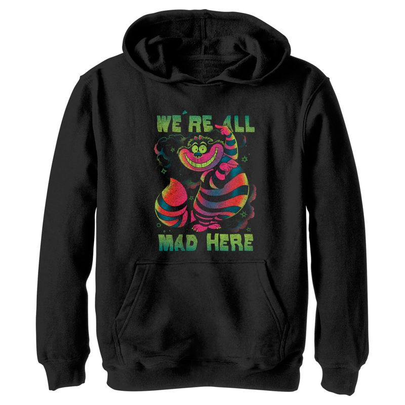انطلق في غابة تولجي لتجد هودي تشيشاير قوس قزح للأولاد الجديد والمرخص رسميًا من ديزني أليس في بلاد العجائب! يتميز هذا التصميم المبهج والملون بقط تشيشاير يشير إلى عبارة "كلنا مجانين هنا" مطبوعة حوله بأحرف خضراء متموجة وخلفية دخانية مليئة بالنجوم واللمعان. ستصاب بالجنون إذا لم تشتري هذا الهودي، فاحصل عليه اليوم!