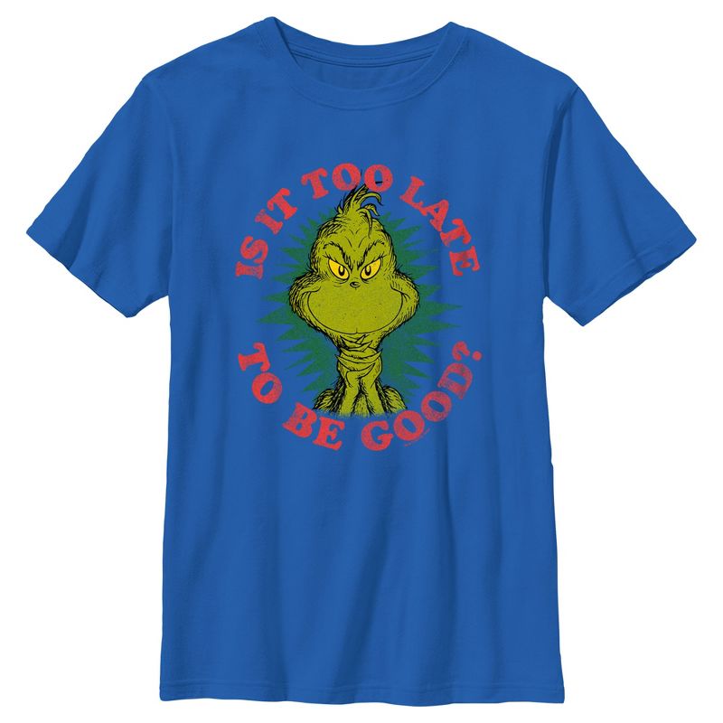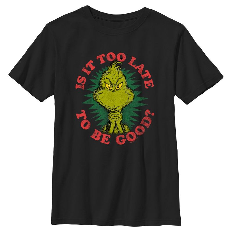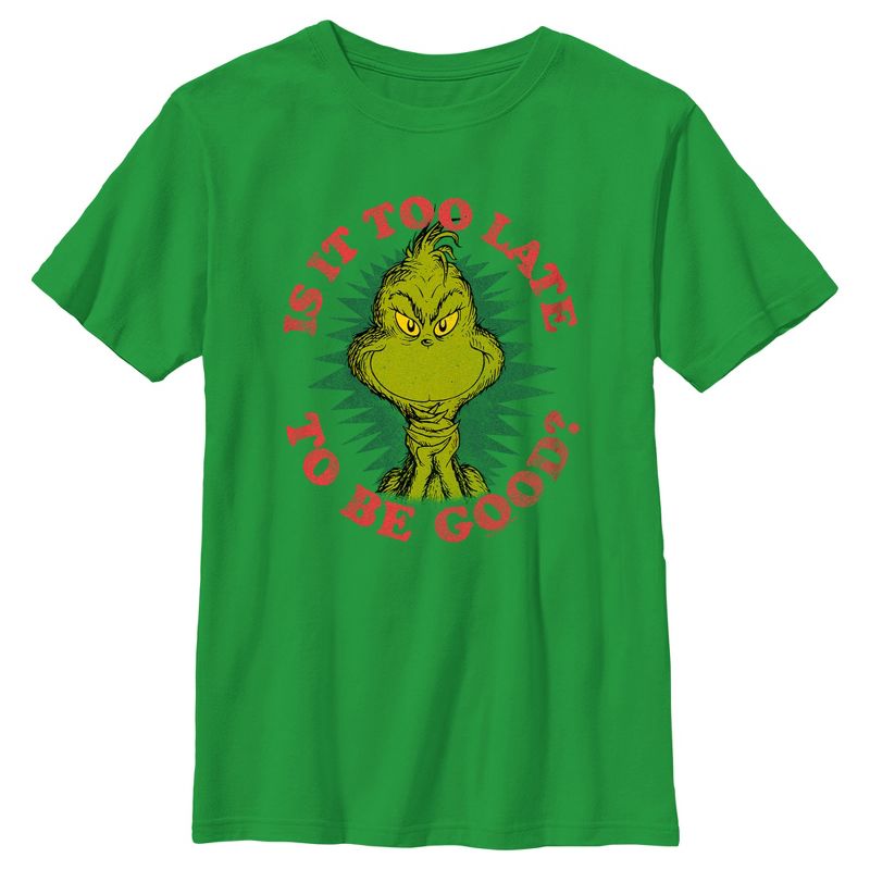 - تباهَ بملابسك الأنيقة مع هذا التيشيرت الجديد للأولاد، مثالي لموسم الأعياد! يحمل صورة غرينش محاطة بعبارة "هل فات الأوان لتكون جيدًا؟" بأسلوب باهت على الجهة الأمامية.