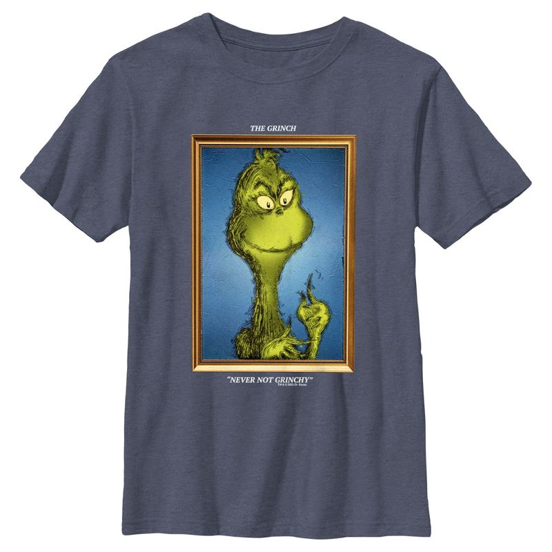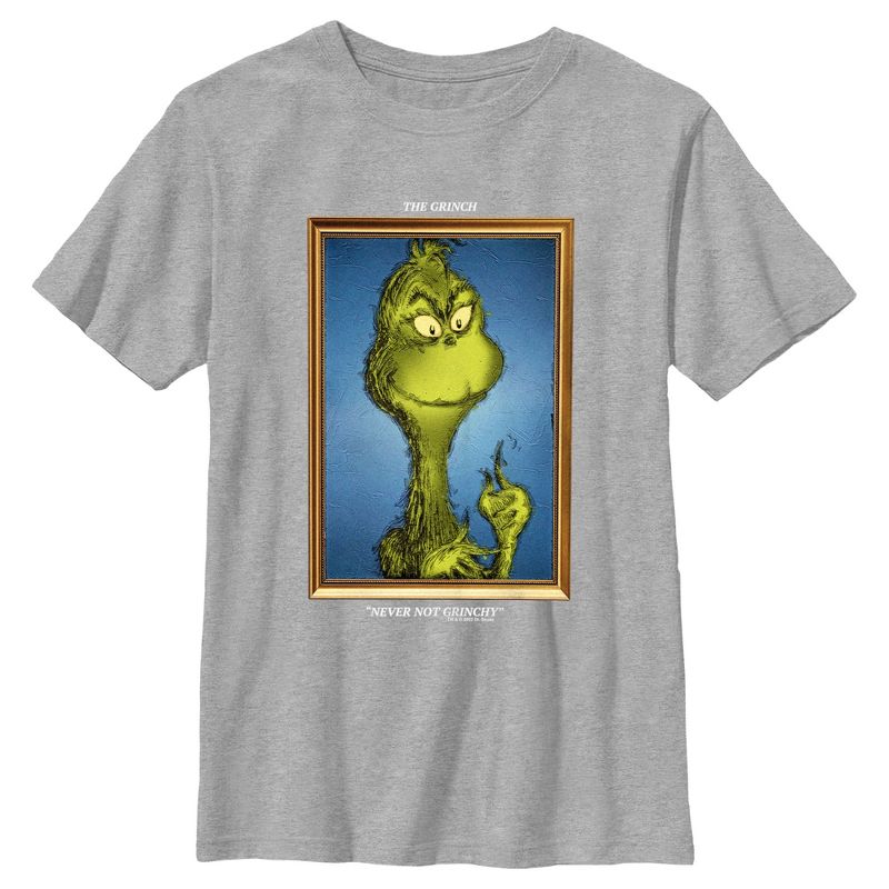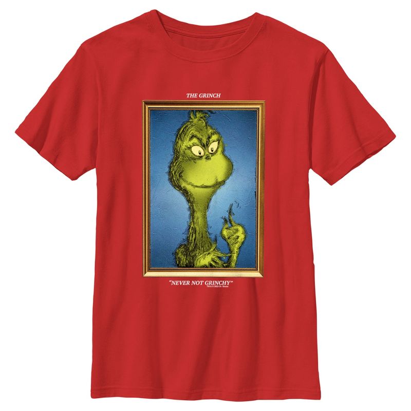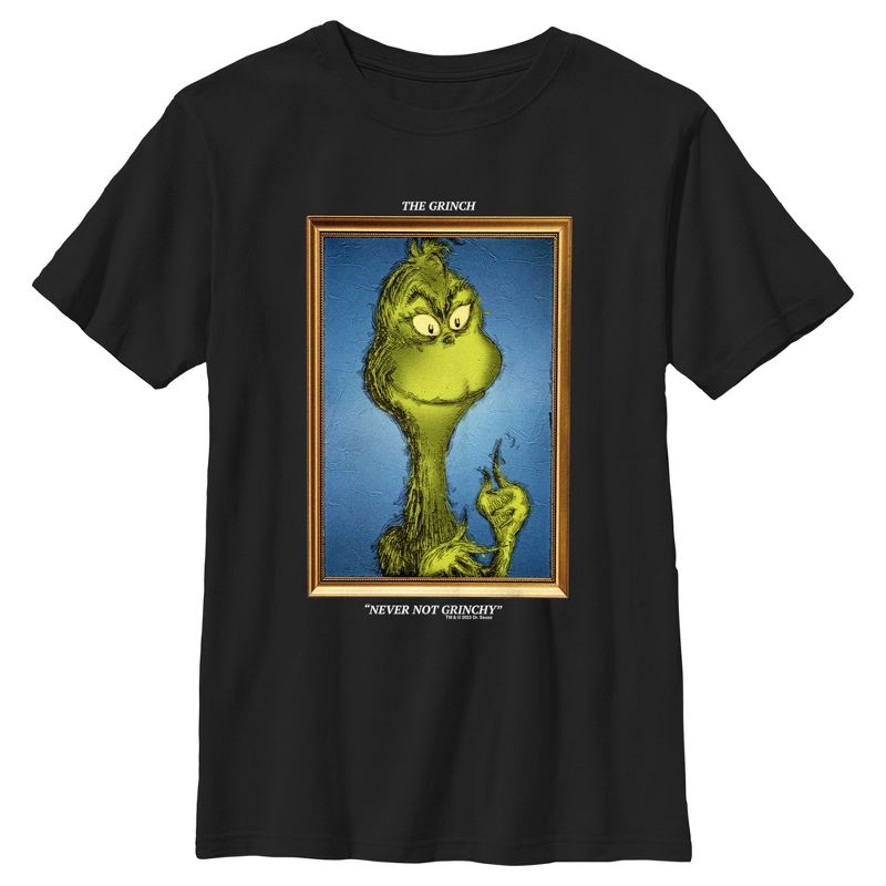 - تباهَ بإطلالة مميزة مع هذا التيشيرت الجديد والأنيق للأولاد، مثالي لجميع المناسبات! يتميز بإطار ذهبي لصورة السيد غرينش وهو يبتسم، مع عبارة "لا تكن غرينشي أبدًا".