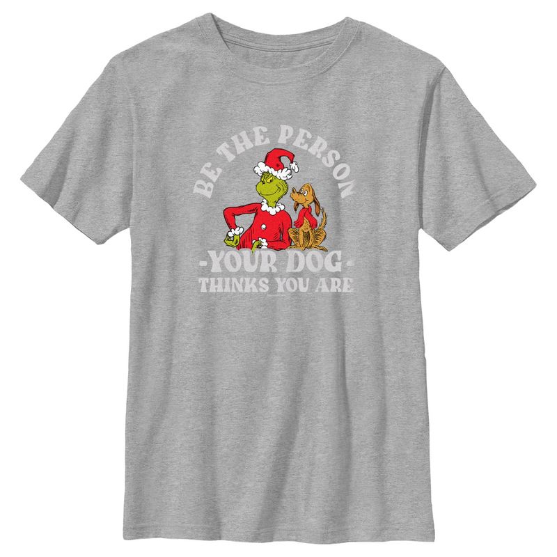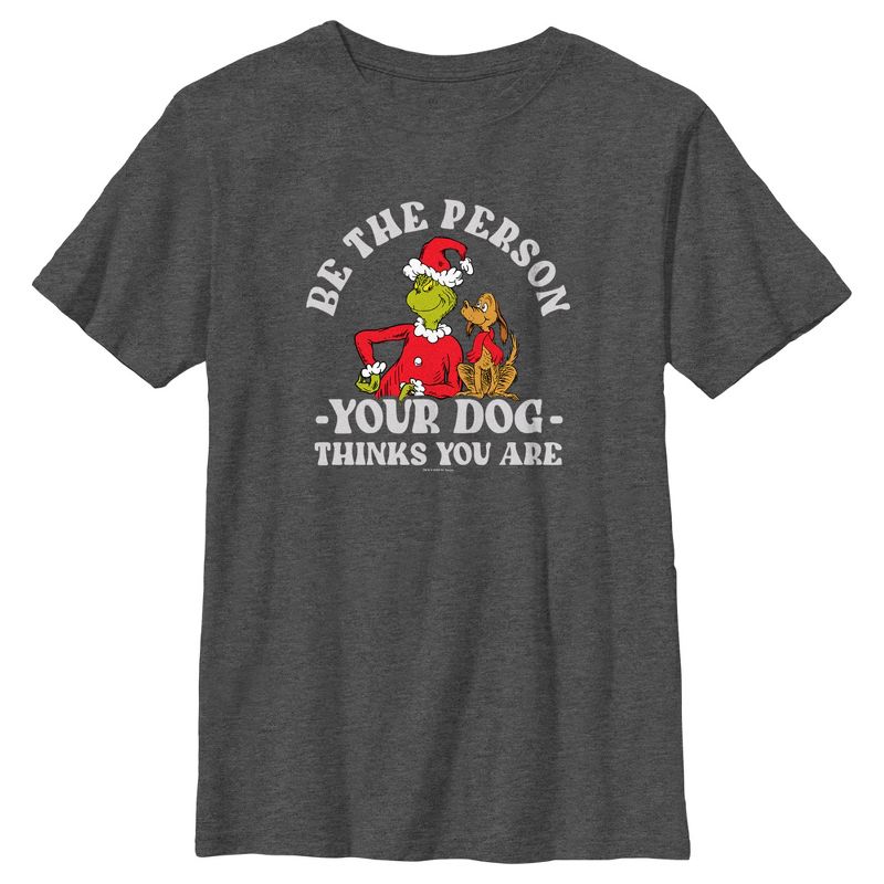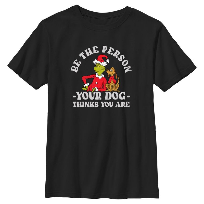 تباهَ بملابسك مع هذا التيشيرت الجديد الأنيق للأولاد، مثالي لأعياد الميلاد! يُظهر غرينش ورفيقه الكلب ماكس، بملابسهما المبهجة، مع عبارة "كن كما يظن كلبك أنك أنت" مطبوعة حولهما.