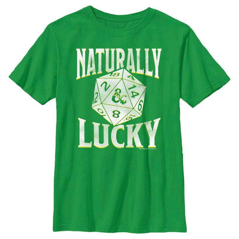 - تباهَ بِأزيائكَ الأنيقة مع هذا التيشيرت الجديد للأولاد، مثاليٌّ لاحتفالات عيد القديس باتريك! يتميز برسمٍ مُهترئ لنرد لعبة "D&D" مع عبارة "Naturally Lucky" باللون الأبيض على الجهة الأمامية.