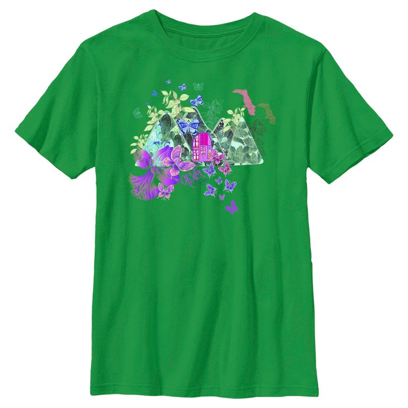 - تظهر الفراشات والطوقان والمزيد باللون الأخضر والفيروزي والأرجواني على الجزء الأمامي من هذا التي شيرت من Encanto.