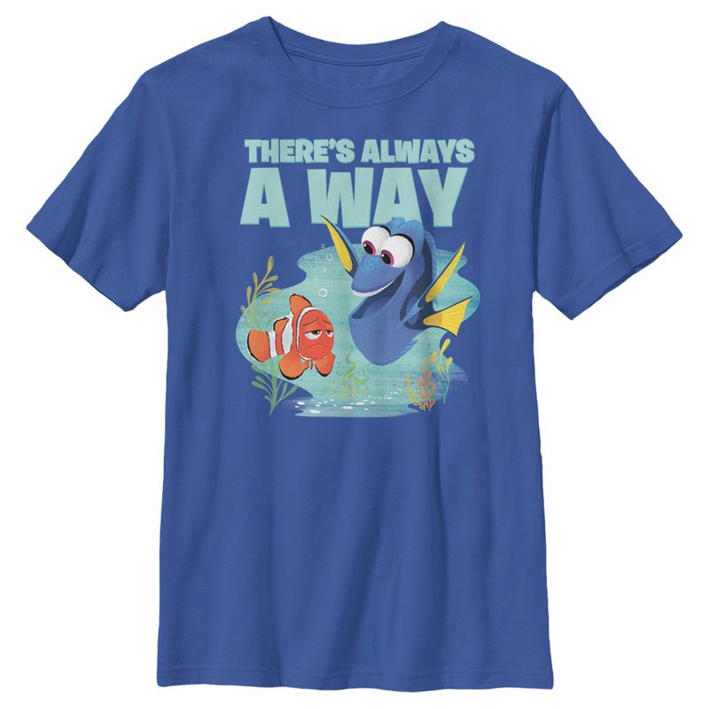 - تباهَ بجمالك مع هذا التيشيرت الجديد الأنيق للأولاد، مثالي لجميع المناسبات! يُظهر مارلين ودوري المبتسمتين وهما يسبحان فوق هذا التيشيرت الرائع المكتوب عليه "هناك دائمًا طريق".